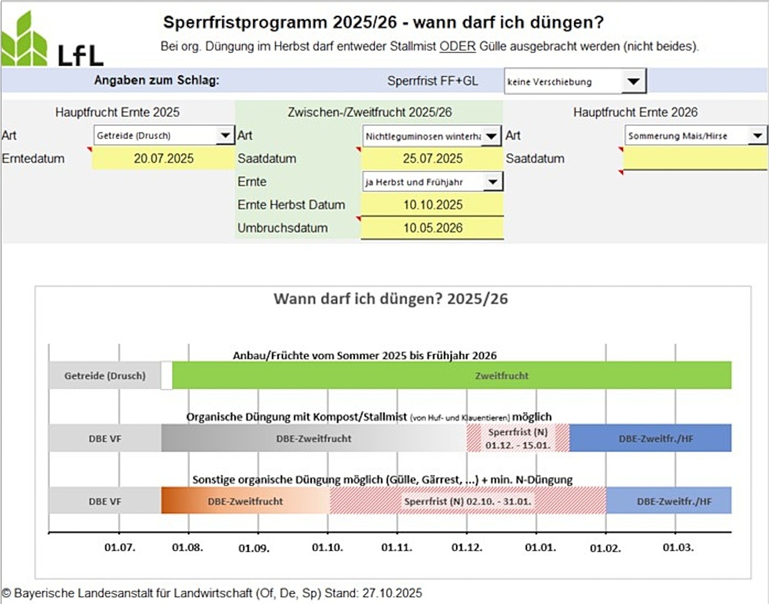 Die Excelanwendung "Sperrfristprogramm" zeigt in Abhängigkeit der angebauten Kultur, ob die Fläche im Herbst noch gedüngt werden darf.