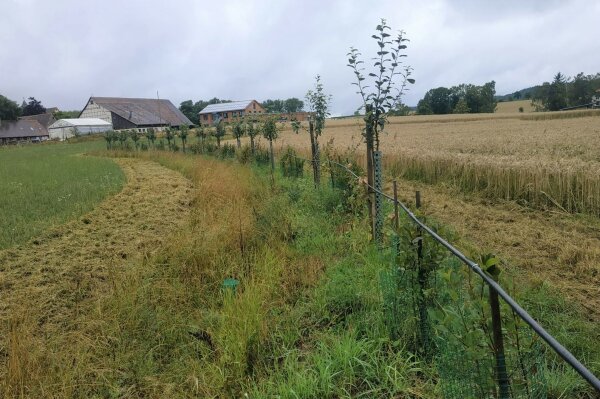 Agroforststreifen mit Apfelbäumen und einem Graben zur Verteilung des Wassers auf der FlächeZoombild vorhanden