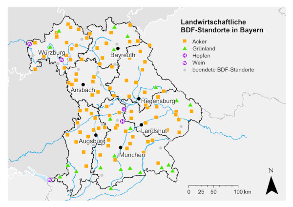 - Die Grünlandflächen im BDF-Programm sind mit einer relativ geringen Anzahl von etwa 20 Standorten vertreten, die sich hauptsächlich im Alpenvorland befinden. Diese Flächen repräsentieren vor allem das kühlere, feuchtere Grünland in Bayern.