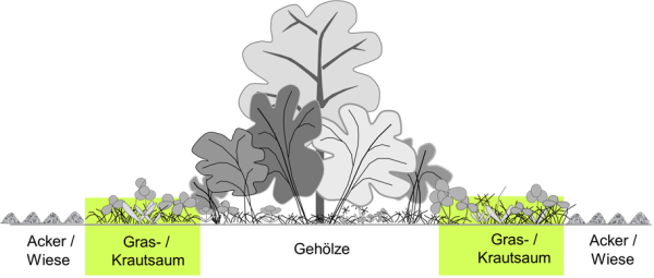 Gras- und Krautsäume entwickeln sich oft entlang von Gehölzstrukturen oder auf ungenutzten Grenzstrukturen. Die Artenzusammensetzung ist von der angrenzenden Nutzung, der Wasserversorgung und den weiteren Standortbedingungen