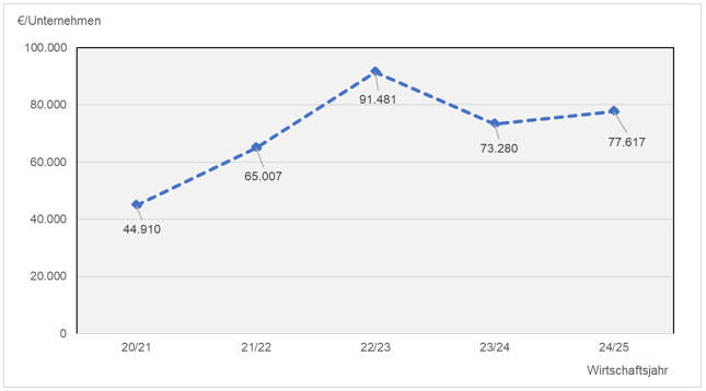 Im Wirtschaftsjahr 2024/2025 ergab sich für die konventionell wirtschaftenden Haupterwerbsbetriebe ein ordentliches Ergebnis von durchschnittlich 77.617 Euro. Gegenüber dem Wirtschaftsjahr 2023/2024 entspricht dies einem Anstieg von 6 Prozent. Während sich die betrieblichen Aufwendungen etwa auf Vorjahresniveau bewegten, war die Gewinnsteigerung auf die Zunahme der betrieblichen Erträge als Folge von höheren Produktpreisen zurückzuführen. Eine differenzierte Betrachtung zwischen den unterschiedlichen Betriebsformen weist jedoch darauf hin, dass nicht alle Landwirte in gleichem Ausmaß von diesem Verlauf profitieren konnten.