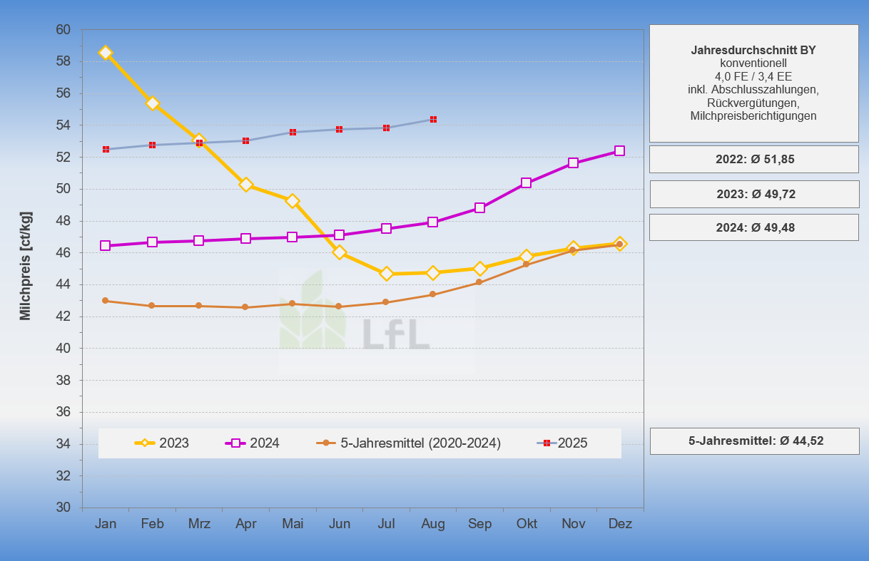 Wird der Verlauf des Jahres gegenübergestellt, ist festzustellen, dass der Milchpreis im Vorjahr kontinuierlich gesunken ist und sich erst in der zweiten Jahreshälfte stabilisiert hat. Der Milchpreis im Jahr 2024 ist dagegen kontinuierlich gestiegen und das bei saisonal steigenden Milchmengen bis Mitte des Jahres, woran auch zu sehen ist, dass der Absatz von Biomilchprodukten wieder deutlich zugenommen hat.