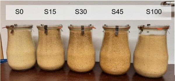 Nach der Silierung war bei den Varianten S0 und S100 kaum eine Farbveränderung im Vergleich zum Einsilierungstag zu erkennen. Im Gegensatz dazu zeigten die Varianten S15, S30 und S45 eine deutliche Bräunung, die mit steigendem Sojabohnenanteil intensiver wurde (siehe Abb. 3). Eine Erklärung könnte die enzymatische Bräunung sein. Diese tritt auf, wenn Luftsauerstoff in die Pflanzenzellen eindringt und die Aminosäure Tyrosin in Melanin, einen braunen Farbstoff, umgewandelt wird. Darüber hinaus verklebte das Material der Körnermais-Sojabohnen-Mischungen nach der Silierung, was die Auslagerung aus den Einmachgläsern erschwerte. Dieser Effekt wurde mit steigendem Sojabohnenanteil stärker, während er bei den reinen Silagen aus nur Körnermais oder nur Sojabohnen nicht beobachtet wurde. Ob dies im Praxismaßstab bei der Entnahme aus dem Silo zu technischen Herausforderungen führen könnte, muss geprüft werden.