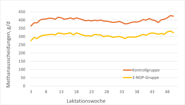 Die Auswirkungen der 3-NOP-Zulage auf die tägliche Methanausscheidungen waren über die gesamte Laktation konstant (siehe Abbildung). Dementsprechend weisen die vorliegenden Ergebnisse nicht auf eine Adaptation der Mikroorganismen im Pansen an das 3-NOP im Zeitverlauf hin.