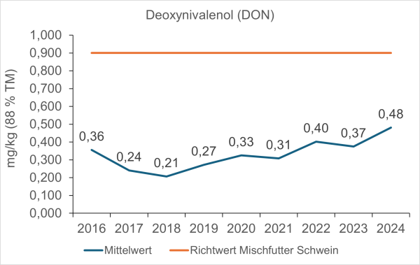 Im Mittel lagen alle DON-Ergebnisse unter den Richtwerten der Europäischen Kommission (2006). Bei genauerer Betrachtung überschritten 7 von 74 Proben den Richtwert von 0,9 mg DON/kg Mischfuttermittel für Schweine (88 % TM). Jedoch lag selbst der höchste gemessene Wert von 1,3 mg DON/kg Weizenkleie (88 % TM) deutlich unter dem Richtwert von 8 mg/kg Einzelfuttermittel.