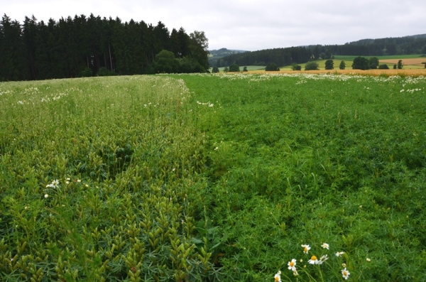 Betriebsleiter Martin Taig und Arnold Gropp (AELF Münchberg) widmeten sich dem Thema der Produktionstechnik der Lupine. Mit überwiegend sandigem Lehm sind die Böden der Region besonders gut für die Ansprüche der Blauen Lupine geeignet. Martin Taig baute im vergangenen sowie in diesem Jahr jeweils 6 Hektar Lupinen an und berichtete über seine Erfahrungen. Die Saat erfolgte am 11. April mit geimpfetem Saatgut. Im Anschluss an die Saat wurden die Flächen gewalzt. Chemische Unkrautbekämpfung ist nur im Vorauflauf zugelassen und erfolgte am 12. April. Die in der Sortendemonstration angebauten Sorten Haags Blaue, Boruta (endständig) und Boregine (verzweigt), verdeutlichten die Unterschiede der Wuchstypen sehr gut.