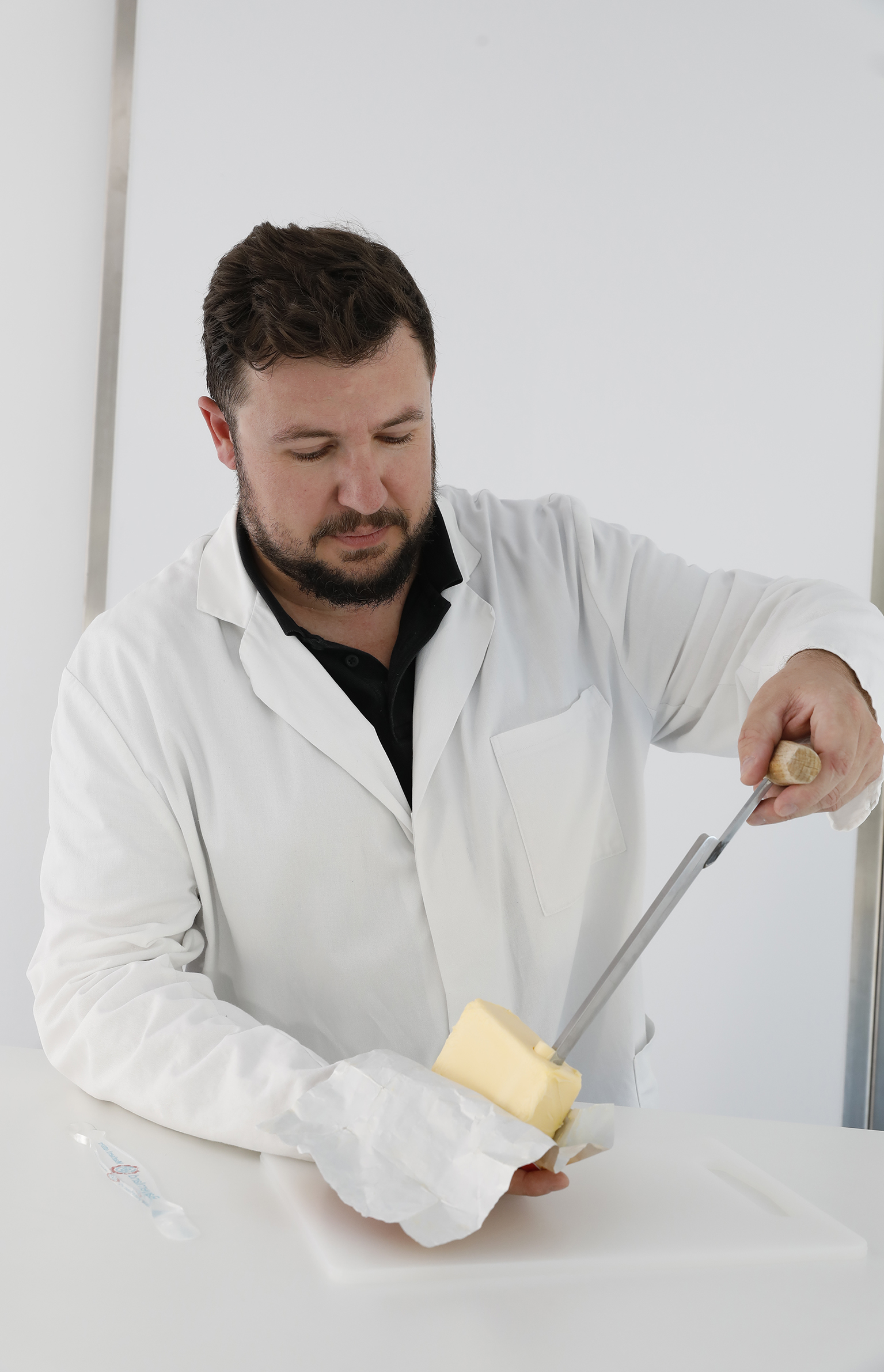 An der amtlichen Butterprüfung nehmen in Bayern insgesamt zwölf Molkereien teil. Der Qualitätscheck erfolgt zweimal pro Monat nach einem vorgegebenen Bewertungsschema. Die zu prüfende Butter muss einer der drei Sorten – Süßrahmbutter, mildgesäuerte Butter oder Sauerrahmbutter – entsprechen. Im Labor wird die Wasserverteilung und die Streichfähigkeit bestimmt. Die Bewertung der sensorischen Eigenschaften – Aussehen, Geruch, Geschmack und Textur – übernimmt eine Prüfungsgruppe. Jede Eigenschaft wird mit Punkten bewertet.