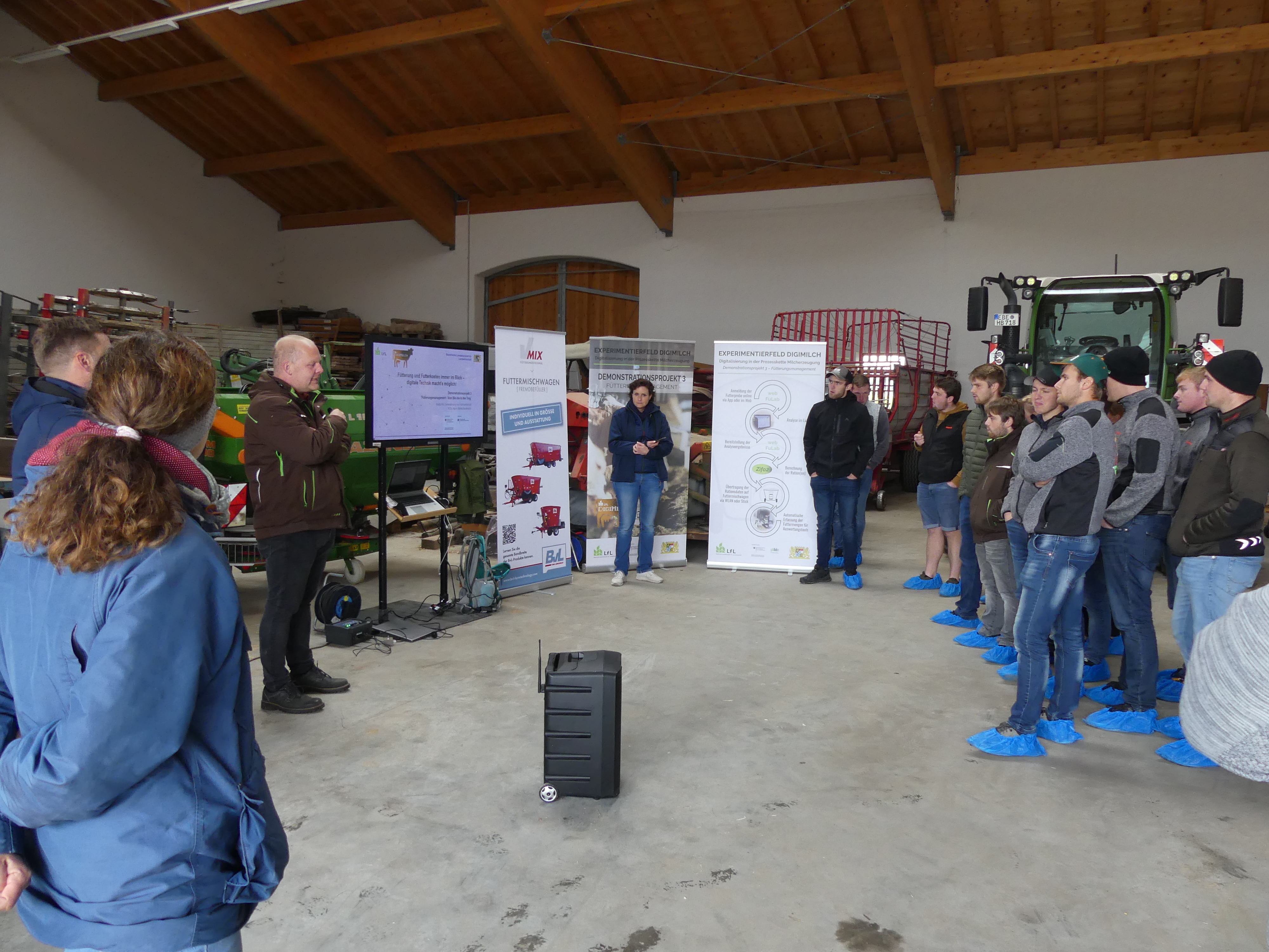 Im Zentrum der Veranstaltung standen die Führungen über den Hof. Betriebsleiter Bernhard Haimmerer und DigiMilch-Projektsprecher Dr. Bernhard Haidn zeigten den Gästen den modernen Milchviehstall für 85 Milchkühe. Die Kühe werden automatisiert gefüttert und gemolken, die Entmistung erledigt ein Roboter. Die mit Hilfe von Sensoren erfassten Daten jeder Kuh laufen in einem Herdenmanagementsystem zusammen.